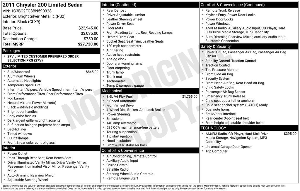The 2011 Chrysler 200 Limited is a well-equipped midsize sedan that offers a compelling blend of style, comfort, and performance. With its sleek exterior design, spacious interior, and impressive list of features, this vehicle is an excellent choice for those seeking a versatile and refined daily driver.