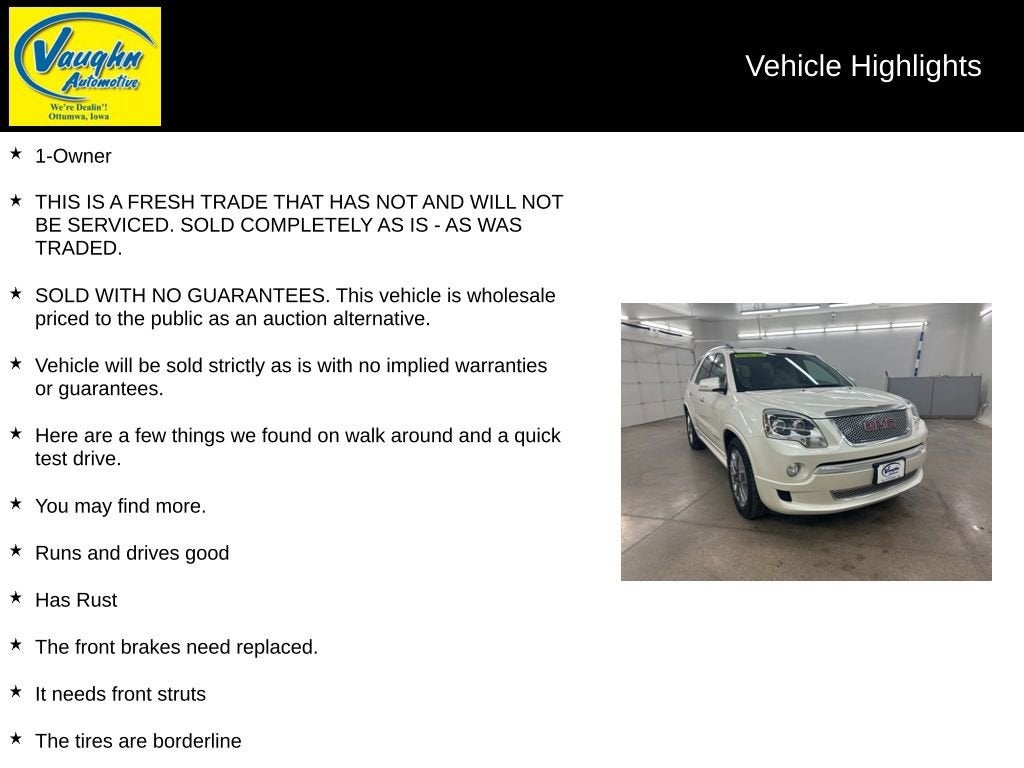 1-Owner, THIS IS A FRESH TRADE THAT HAS NOT AND WILL NOT BE SERVICED. SOLD COMPLETELY AS IS - AS WAS TRADED., SOLD WITH NO GUARANTEES. This vehicle is wholesale priced to the public as an auction alternative., Vehicle will be sold strictly as is with no implied warranties or guarantees., Here are a few things we found on walk around and a quick test drive., You may find more., Runs and drives good, Has Rust, The front brakes need replaced., It needs front struts, The tires are borderline, 6-Speed Automatic Electronic with Overdrive, AWD, Light Titanium w/Leather-Appointed Seat Trim. 3.6L V6 SIDI White Diamond Tricoat 2012 GMC Acadia Denali Odometer is 28097 miles below market average!