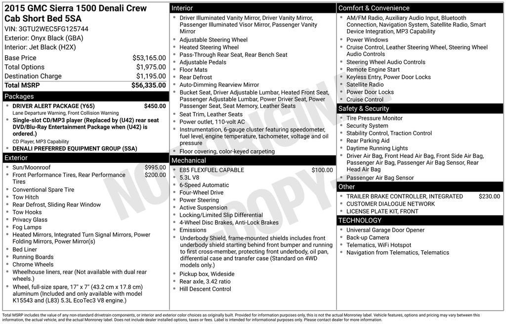 Vehicle Sold As-Is, Without any warranty, will not fully pass our standard inspection, A copy of the vehicle inspection is available upon request- Remote Start- Trailer Brake Controller, Integrated- Driver Alert Package- Preferred Equipment Group 5SA- Trailering EquipmentVehicle DetailedThis 2015 GMC Sierra 1500 Denali is a powerful and well-equipped full-size pickup that's ready to take on your toughest tasks. Under the hood, you'll find a robust EcoTec3 5.3L V8 engine paired with a smooth-shifting 6-speed automatic transmission, providing the perfect balance of performance and efficiency. With its four-wheel-drive capabilities, this Sierra is ready to conquer any terrain, whether you're hauling heavy loads or exploring the great outdoors.The exterior of this Sierra Denali exudes a commanding presence, thanks to its bold black finish and chrome accents. The 20-inch chrome wheels and body-color front bumper add a touch of style and sophistication. Inside, the cabin is outfitted with premium features, including a Bose sound system, SiriusXM satellite radio, and a large 8-inch touchscreen navigation system. The heated and cooled front bucket seats, along with the dual-zone automatic climate control, ensure exceptional comfort for both the driver and passengers.Safety is also a top priority, with features like lane departure warning, forward collision alert, and a rear vision camera to help you navigate with confidence. The integrated trailer brake controller and trailering equipment make this Sierra Denali an excellent choice for those who need to tow heavy loads.Whether you're looking for a capable work truck or a versatile daily driver, this 2015 GMC Sierra 1500 Denali is sure to impress. With its impressive combination of power, technology, and premium amenities, it's the perfect blend of utility and luxury.With Vaughn Best Deal Pricing, there is no arguing just a great deal. We make buying a vehicle fast, easy, and fun.Online price excludes $25 title fee, $15 electronic processing fee, $10 lien fee (if applicable), and a $180 Vaughn processing fee. Iowa buyers will pay Iowa use tax and license at delivery. Out-of-state buyers will pay their local tax, license, and applicable fees at delivery, plus a $165 out-of-state registration service fee. Vehicles are not available for sale to licensed dealers or vehicle resellers.Drive to Ottumwa and discover why customers have trusted our family since 1934.