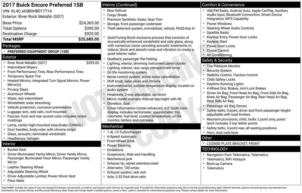 1-Owner, Dealer Inspection, Vehicle Sold As-Is, Without any warranty, will not fully pass our standard inspection, A copy of the vehicle inspection is available upon request, Vehicle Detailed, Recent Oil Change, New Wiper Blades, 4 New Tires, As-Is No Warranty: Sold as is without warranty, Recent oil change, New Wipers, Vehicle did not pass our inspection due to 1 or more of the items listed below, This vehicle runs, drives and shifts okay., The A/C and heater function properly and the electrical system works as designed., There is cosmetic wear on the interior and exterior expected of the vehicle's age., There is a moderate oil leak underneath the vehicle., The tire pressure sensor light is on., It has some hail dings and random scratches. Priced as-is, It has good brakes, The front strut mount busshings are worn and make a slight popping noise when turning., 6-Speed Automatic Electronic with Overdrive, FWD, Ebony Cloth, 6 Speakers, 6-Way Power Driver Seat Adjuster, Apple CarPlay/Android Auto, Exterior Parking Camera Rear, Radio: Buick IntelliLink AM/FM Stereo, SiriusXM Satellite Radio, Wheels: 18 Machined-Face Alloy. ECOTEC 1.4L I4 SMPI DOHC Turbocharged VVT River Rock Metallic 2017 Buick Encore Preferred Priced below KBB Fair Purchase Price! 25/33 City/Highway MPG