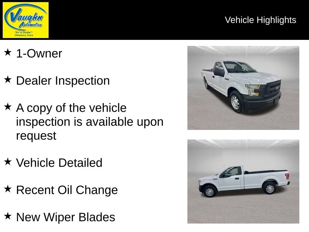 1-Owner, Dealer Inspection, A copy of the vehicle inspection is available upon request, Vehicle Detailed, Recent Oil Change, New Wiper Blades, 4 New Tires, Keyless Entry Remote, As-Is No Warranty: Sold as is without warranty, Recent oil change, New Wipers, Vehicle did not pass our inspection due to 1 or more of the items listed below, This vehicle runs, drives and shifts okay., The A/C and heater function properly and the electrical system works as designed., The left fender has a crease/scratch, The right tail lamp is broken, there is a vibration that can be felt between 50 and 55 mph. The tecnician believs the driveshaft may be slightly out of balance, It has good brakes, 6-Speed Automatic Electronic, RWD, Medium Earth Gray Cloth, 4 Speakers, 4.2 Productivity Screen in Instrument Cluster, ABS brakes, Air Conditioning, Class IV Trailer Hitch Receiver, Cloth 40/20/40 Front Seat, Compass, Cruise Control, Dual front impact airbags, Dual front side impact airbags, Electronic Stability Control, Equipment Group 101A Mid, Fully automatic headlights, Low tire pressure warning, Occupant sensing airbag, Outside temperature display, Overhead airbag, Radio: AM/FM Stereo/Single-CD Player, SYNC, Telescoping steering wheel, Tilt steering wheel, Traction control, Wheels: 17 Silver Steel, XL Power Equipment Group. 3.5L V6 Ti-VCT Oxford White 2017 Ford F-150 XL Priced below KBB Fair Purchase Price! Odometer is 8975 miles below market average!