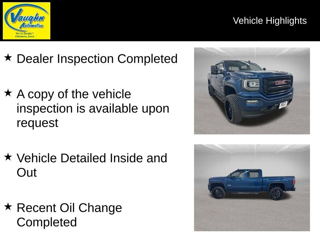 Buy Online with Confidence. We Ship! No hidden fees, transparent no-haggle pricing, and vehicles market-priced daily at Vaughn Automotive.- Dealer Inspection Completed- Vehicle Detailed Inside and Out- Recent Oil Change Completed- New Wiper Blades Installed- 4 New Tires- 50/50 Powertrain Guarantee- It has loud aftermarket exhaustThis 2017 GMC Sierra 1500 SLT is packed with premium features that will elevate your driving experience. Equipped with the powerful EcoTec3 6.2L V8 engine and 8-speed automatic transmission, this Sierra delivers impressive performance and capability. The All Terrain SLT Premium Package adds rugged style and off-road capability with features like 20-inch bright machined aluminum wheels, high-performance LED headlamps, front and rear park assist, and a sliding rear window.Inside, you'll enjoy the comfort and convenience of heated and ventilated front bucket seats, a heated steering wheel, Bose premium audio system, and an 8-inch color touch screen navigation system with IntelliLink. The power sunroof, wireless charging, and integrated trailer brake controller further enhance the Sierra's premium appeal.Whether you're tackling tough terrain or cruising down the highway, this Sierra 1500 SLT is ready to take you there in style and comfort. With its impressive capabilities, thoughtful features, and striking good looks, this truck is sure to impress.4 New Tires InstalledVehicle DetailedWith Vaughn Best Deal Pricing, there is no arguing just a great deal. We make buying a vehicle fast, easy, and fun.Online price excludes $25 title fee, $15 electronic processing fee, $10 lien fee (if applicable), and a $180 Vaughn processing fee. Iowa buyers will pay Iowa use tax and license at delivery. Out-of-state buyers will pay their local tax, license, and applicable fees at delivery, plus a $165 out-of-state registration service fee. Vehicles are not available for sale to licensed dealers or vehicle resellers.Drive to Ottumwa and discover why customers have trusted our family since 1934.