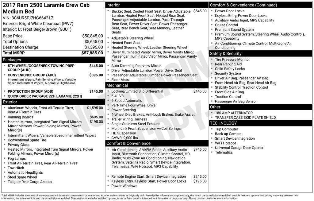 Dealer Inspection, Vehicle Sold As-Is, Without any warranty, will not fully pass our standard inspection, A copy of the vehicle inspection is available upon request, Vehicle Detailed, Recent Oil Change, New Wiper Blades, This Vehicle Has One or More Open Recalls, Ask Dealer for Details., As-Is No Warranty: Sold as is without warranty, Recent oil change, New Wipers, Vehicle did not pass our inspection due to 1 or more of the items listed below, This vehicle runs, drives and shifts okay., The A/C and heater function properly and the electrical system works as designed., This vehicle is equipped with power control options., The check engine light is on with the following codes: P0456 and P0457 Evap leak, There are no parts available to complete the OPEN RECALL as of 12/31/25, The suspension is stiff and the steering binds a bit. All likely caused by the lift and tire size, It is missing a spare, jack, and tools, It has good tires and brakes, 6-Speed Automatic, 4WD, Lt Frost Beige/Brown Leather. 6.4L Heavy Duty V8 HEMI w/MDS Bright White Clearcoat 2017 Ram 2500 Laramie Priced below KBB Fair Purchase Price!