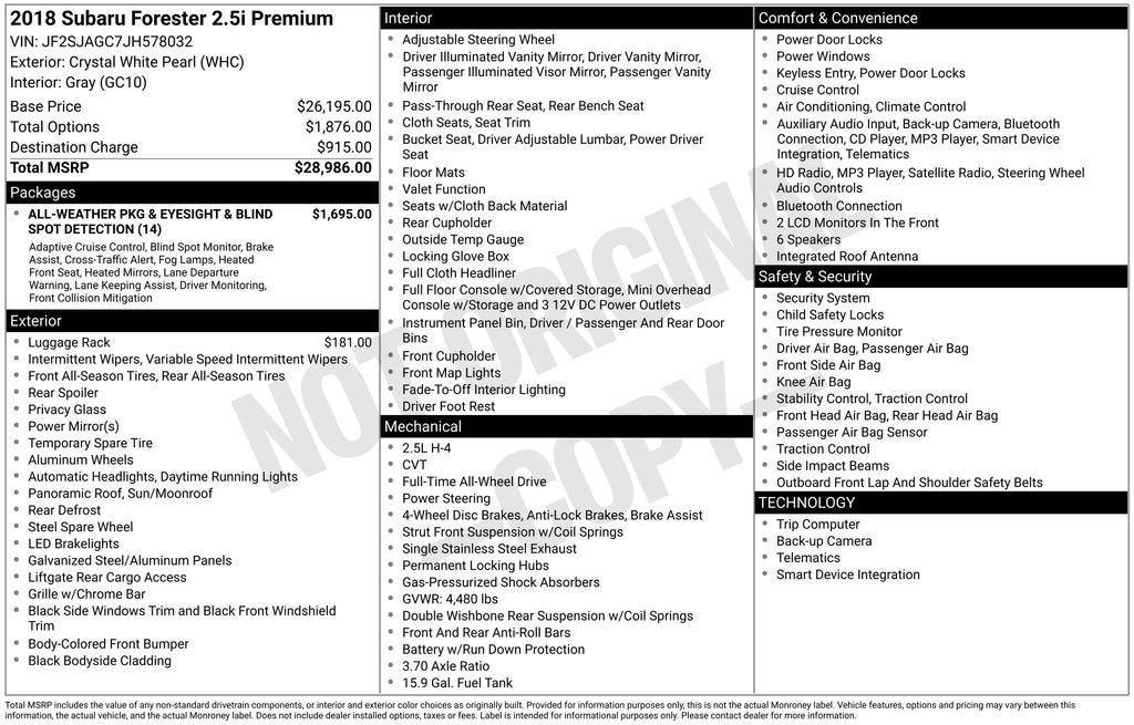 With its thoughtful design, advanced safety features, and proven Subaru reliability, this 2018 Forester 2.5i Premium is an exceptional value. Schedule a test drive today and experience the difference for yourself.