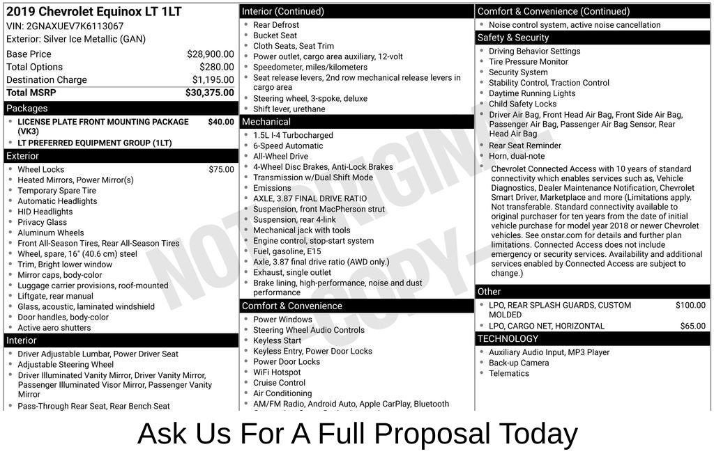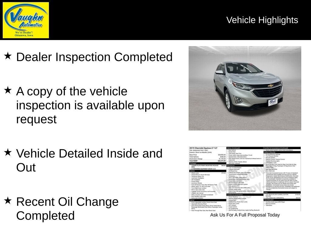 Dealer Inspection Completed, Vehicle Sold As-Is, Without any warranty, will not fully pass our standard inspection, Vehicle Detailed Inside and Out, Recent Oil Change Completed, New Wiper Blades Installed, 6-Speed Automatic Electronic with Overdrive, AWD, Jet Black Cloth. 1.5L DOHC Silver Ice Metallic 2019 Chevrolet Equinox LT 25/30 City/Highway MPG