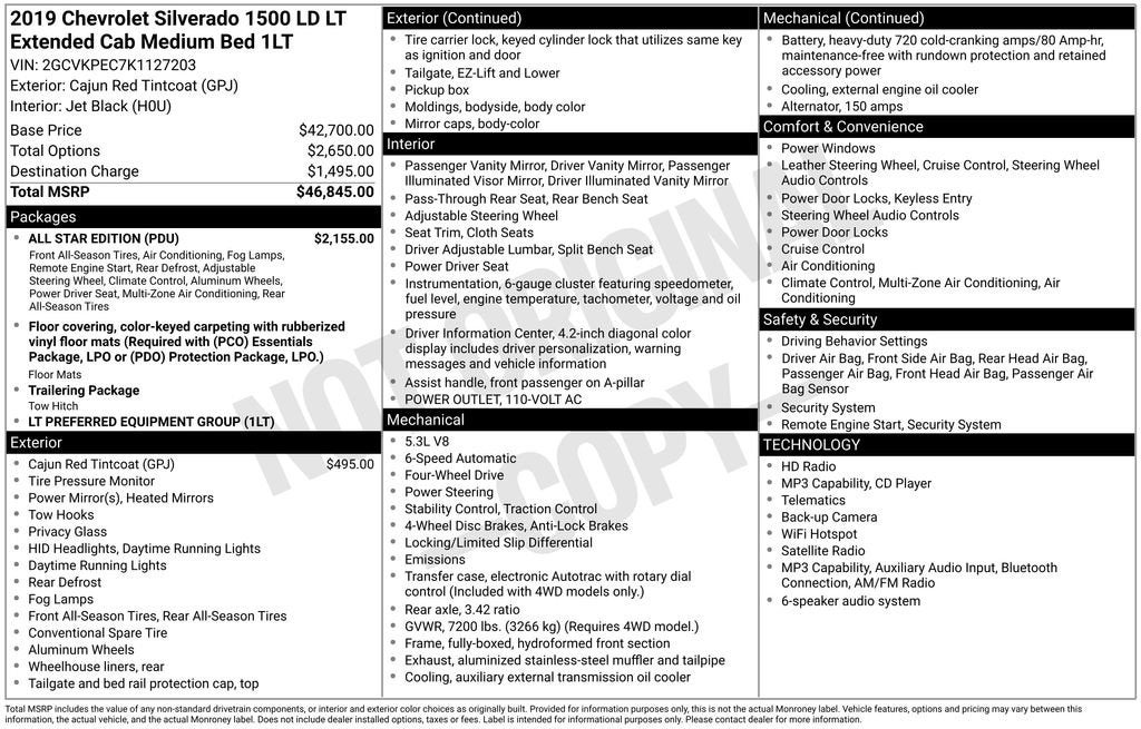 Certified. 1-Owner, Dealer Inspection Completed, A copy of the vehicle inspection is available upon request, Vehicle Detailed Inside and Out, Recent Oil Change Completed, New Wiper Blades Installed, Silverado 1500 LD LT, 6-Speed Automatic Electronic with Overdrive, 4WD, Cajun Red Tintcoat, Black Cloth, 10-Way Power Driver's Seat Adjuster, 110-Volt AC Power Outlet, 3.42 Rear Axle Ratio, 4-Wheel Disc Brakes, 6 Speakers, ABS brakes, All Star Edition, AM/FM radio: SiriusXM, Dual front impact airbags, Dual front side impact airbags, Dual-Zone Automatic Climate Control, Electronic Stability Control, Emergency communication system: OnStar and Chevrolet connected services capable, Front anti-roll bar, Fully automatic headlights, Integrated Trailer Brake Controller, Manual Tilt & Telescoping Steering Column, Occupant sensing airbag, Overhead airbag, Premium audio system: Chevrolet MyLink, Rear-Window Electric Defogger, Remote Locking Tailgate, Remote Vehicle Starter System, Steering wheel mounted audio controls, Traction control, Unauthorized Entry Theft-Deterrent System. EcoTec3 5.3L V8 Cajun Red Tintcoat 2019 Chevrolet Silverado 1500 LD LT