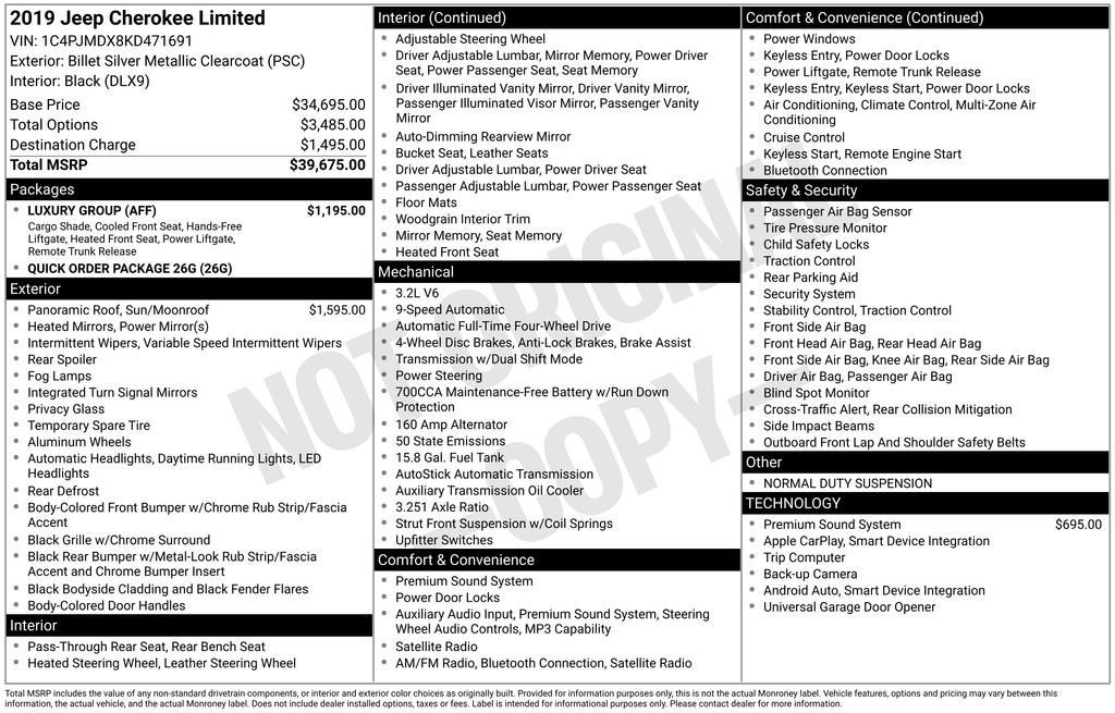 Buy Online with Confidence. We Ship! No hidden fees, transparent no-haggle pricing, and vehicles market-priced daily at Vaughn Automotive.- 1-Owner- A copy of the vehicle inspection is available upon request- Certified Warranty- Dealer Inspection Completed- New Wiper Blades Installed- Recent Oil Change Completed- Remote Start- Vehicle Detailed Inside and Out- Luxury Group- Power Front/Fixed Rear Full Sunroof- 9 Amplified Speakers w/SubwooferVehicle DetailedThis 2019 Jeep Cherokee Limited is a standout in its class, offering a winning combination of capability, comfort, and convenience. Boasting a powerful 3.2L V6 engine paired with a smooth-shifting 9-speed automatic transmission, this 4WD SUV delivers an impressive balance of performance and efficiency, with an EPA-estimated 19 city/27 highway mpg.The exterior of this Cherokee Limited exudes a refined, sophisticated style in the timeless Silver color. But the real story lies beneath the surface, where you'll find a wealth of premium features and advanced technologies that elevate the driving experience. From the hands-free power liftgate and ventilated front seats to the 9-speaker audio system and full-length sunroof, this vehicle is designed to pamper you and your passengers.Safety and security are also top priorities, with a comprehensive suite of advanced driver-assistance features, including electronic stability control, traction control, and a ParkView rear backup camera. And with the Certified Warranty, you can drive with confidence, knowing that this Jeep has been thoroughly inspected and backed by an industry-leading warranty.Whether you're tackling your daily commute or embarking on a weekend adventure, this 2019 Jeep Cherokee Limited is ready to exceed your expectations. Experience the difference that premium features, exceptional capability, and uncompromising quality can make in your daily driving.With Vaughn Best Deal Pricing, there is no arguing just a great deal. We make buying a vehicle fast, easy, and fun.Online price excludes $25 title fee, $15 electronic processing fee, $10 lien fee (if applicable), and a $180 Vaughn processing fee. Iowa buyers will pay Iowa use tax and license at delivery. Out-of-state buyers will pay their local tax, license, and applicable fees at delivery, plus a $165 out-of-state registration service fee. Vehicles are not available for sale to licensed dealers or vehicle resellers.Drive to Ottumwa and discover why customers have trusted our family since 1934.