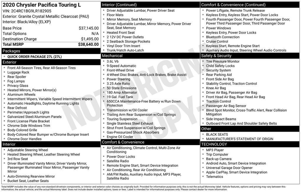 BUY ONLINE, WE SHIP!!! NO HIDDEN COSTS, NO HAGGLE PRICING, & OUR VEHICLES ARE MARKET PRICED DAILY AT VAUGHN AUTOMOTIVE.Certified. Dealer Inspection Completed, A copy of the vehicle inspection is available upon request, Vehicle Detailed Inside and Out, Recent Oil Change Completed, New Wiper Blades Installed, 4 New Tires, Remote Start, 9-Speed 948TE Automatic, FWD, Black/Alloy Leather, 17 x 7.0 Aluminum Wheels, 3rd row seats: split-bench, 6 Speakers, ABS brakes, AM/FM radio: SiriusXM, Apple CarPlay/Android Auto, Auto-dimming Rear-View mirror, Automatic temperature control, Blind Spot & Rear Cross Path Detection, Compass, Dual front impact airbags, Dual front side impact airbags, Electronic Stability Control, Emergency communication system: Uconnect Access, Front dual zone A/C, Front fog lights, Fully automatic headlights, Garage door transmitter, Heated door mirrors, Heated Front Seats, Heated steering wheel, Integrated Voice Command w/Bluetooth®, Knee airbag, Low tire pressure warning, Memory seat, Occupant sensing airbag, Outside temperature display, Overhead airbag, Overhead console, ParkView Rear Back-Up Camera, Power door mirrors, Power Liftgate, Radio: Uconnect 4 w/7 Display, Rear air conditioning, Reclining 3rd row seat, Remote keyless entry, Security system, SiriusXM Satellite Radio, Speed control, Steering wheel mounted audio controls, Telescoping steering wheel, Tilt steering wheel, Touring Suspension, Traction control, USB Host Flip. 3.6L V6 24V VVT Granite Crystal Metallic Clearcoat 2020 Chrysler Pacifica Touring L Odometer is 7555 miles below market average! 19/28 City/Highway MPGCertification Program Details: J.D. Power Edge Certified Pre-Owned: • 90 Day/3,000 Mile Limited Warranty with Platinum (The Best) Coverage • 165-Point Inspection o Vehicle History Report o Full Road Test o Tire & Brakes o Transmission o Engine Components o Electrical Components • 24-Hour Roadside Assistance & Towing (1 Year) • Rental car reimbursement • Lodging assistance • Extend coverage options availableOur Vaughn Best Deal Pricing skips the arguing and you get a great deal. Plus it makes buying a car fast and fun! Online Price excludes $25 title, $15 electronic processing, $10 lien Fee (if applicable), and $180 Vaughn processing fee. Iowa buyers will pay Iowa Use Tax & License at delivery. Out of state buyers will pay their local tax, license, and other fees at delivery plus $165 out-of-state registration service fee. Vehicle not available for sale to other licensed dealers or vehicle resellers. Drive to Ottumwa and find out why people have been buying their vehicles from our family since 1934.http://www.realdeal.com/g3ion