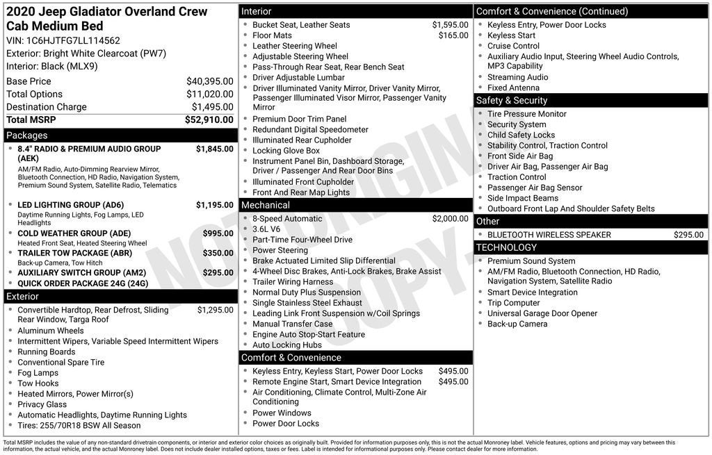 BUY ONLINE, WE SHIP!!! NO HIDDEN COSTS, NO HAGGLE PRICING, & OUR VEHICLES ARE MARKET PRICED DAILY AT VAUGHN AUTOMOTIVE.Certified. Dealer Inspection Completed, A copy of the vehicle inspection is available upon request, Vehicle Detailed Inside and Out, Recent Oil Change Completed, New Wiper Blades Installed, 8-Speed Automatic, 4WD, Black Leather, 1-Year SiriusXM Guardian Trial, 240 Amp Alternator, 400W Inverter, 5-Year SiriusXM Traffic Service, 5-Year SiriusXM Travel Link Service, 700 Amp Maintenance Free Battery, 8.4 Radio & Premium Audio Group, ABS brakes, Alpine Premium Audio System, Apple CarPlay/Android Auto, Auto-Dimming Rear-View Mirror, Automatic temperature control, Auxiliary Switch Group, Auxiliary Switches, Black 3-Piece Hard Top, Class IV Hitch Receiver, Cold Weather Group, Daytime Running Lamps LED Accents, Dual front impact airbags, Dual front side impact airbags, Electronic Stability Control, Emergency/Assistance Call, For Details, Visit DriveUconnect.com, Freedom Panel Storage Bag, Front dual zone A/C, Front fog lights, Front LED Fog Lamps, Fully automatic headlights, Garage door transmitter, HD Radio, Heated door mirrors, Heated Front Seats, Heated Steering Wheel, Heavy-Duty Engine Cooling, Integrated roll-over protection, LED Lighting Group, LED Park Turn Lamps, LED Reflector Headlamps, LED Taillamps, Low tire pressure warning, No Soft Top, Occupant sensing airbag, Outside temperature display, ParkView Rear Back-Up Camera, Power door mirrors, Radio: Uconnect 4C Nav w/8.4 Display, Rear Sliding Window, Rear Window Defroster, Remote Proximity Keyless Entry, Remote Start System, Security system, SiriusXM Traffic Plus, SiriusXM Travel Link, Speed control, Split folding rear seat, Steering wheel mounted audio controls, Telescoping steering wheel, Tilt steering wheel, Traction control, Trailer Hitch Zoom, Trailer Tow Package, Wheels: 18 x 7.5 Granite Crystal Aluminum. 3.6L V6 24V VVT Bright White Clearcoat 2020 Jeep Gladiator Overland Priced below KBB Fair Purchase Price! Odometer is 3750 miles below market average!Certification Program Details: J.D. Power Edge Certified Pre-Owned: • 90 Day/3,000 Mile Limited Warranty with Platinum (The Best) Coverage • 165-Point Inspection o Vehicle History Report o Full Road Test o Tire & Brakes o Transmission o Engine Components o Electrical Components • 24-Hour Roadside Assistance & Towing (1 Year) • Rental car reimbursement • Lodging assistance • Extend coverage options availableAwards:* 2020 KBB.com 10 Favorite New-for-2020 Cars * NACTOY 2020 North American Truck of the Year Our Vaughn Best Deal Pricing skips the arguing and you get a great deal. Plus it makes buying a car fast and fun! Online Price excludes $25 title, $15 electronic processing, $10 lien Fee (if applicable), and $180 Vaughn processing fee. Iowa buyers will pay Iowa Use Tax & License at delivery. Out of state buyers will pay their local tax, license, and other fees at delivery plus $165 out-of-state registration service fee. Vehicle not available for sale to other licensed dealers or vehicle resellers. Drive to Ottumwa and find out why people have been buying their vehicles from our family since 1934.http://www.realdeal.com/