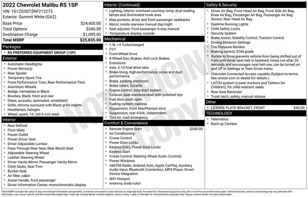 Certified. 1-Owner, Dealer Inspection Completed, A copy of the vehicle inspection is available upon request, Vehicle Detailed Inside and Out, Recent Oil Change Completed, New Wiper Blades Installed, 4 New Tires, CVT, FWD, Jet Black Cloth, 18 Aluminum Wheels, 6-Speaker Audio System Feature, 8-Way Power Driver Seat Adjuster, ABS brakes, Air Conditioning, Dual front impact airbags, Dual front side impact airbags, Electronic Stability Control, Emergency communication system: OnStar and Chevrolet connected services capable, Exterior Parking Camera Rear, Fully automatic headlights, Knee airbag, Low tire pressure warning, Occupant sensing airbag, Overhead airbag, Overhead console, Power door mirrors, Power Driver Lumbar Control Seat Adjuster, Premium audio system: Chevrolet Infotainment 3, Radio: Chevrolet Infotainment 3 System, Rear anti-roll bar, Rear side impact airbag, Rear window defroster, Remote Vehicle Starter System, Security system, Speed control, Split folding rear seat, Steering wheel mounted audio controls, Telescoping steering wheel, Tilt steering wheel, Traction control, Wireless Apple CarPlay/Android Auto. 1.5L DOHC Summit White 2022 Chevrolet Malibu RS 29/36 City/Highway MPG