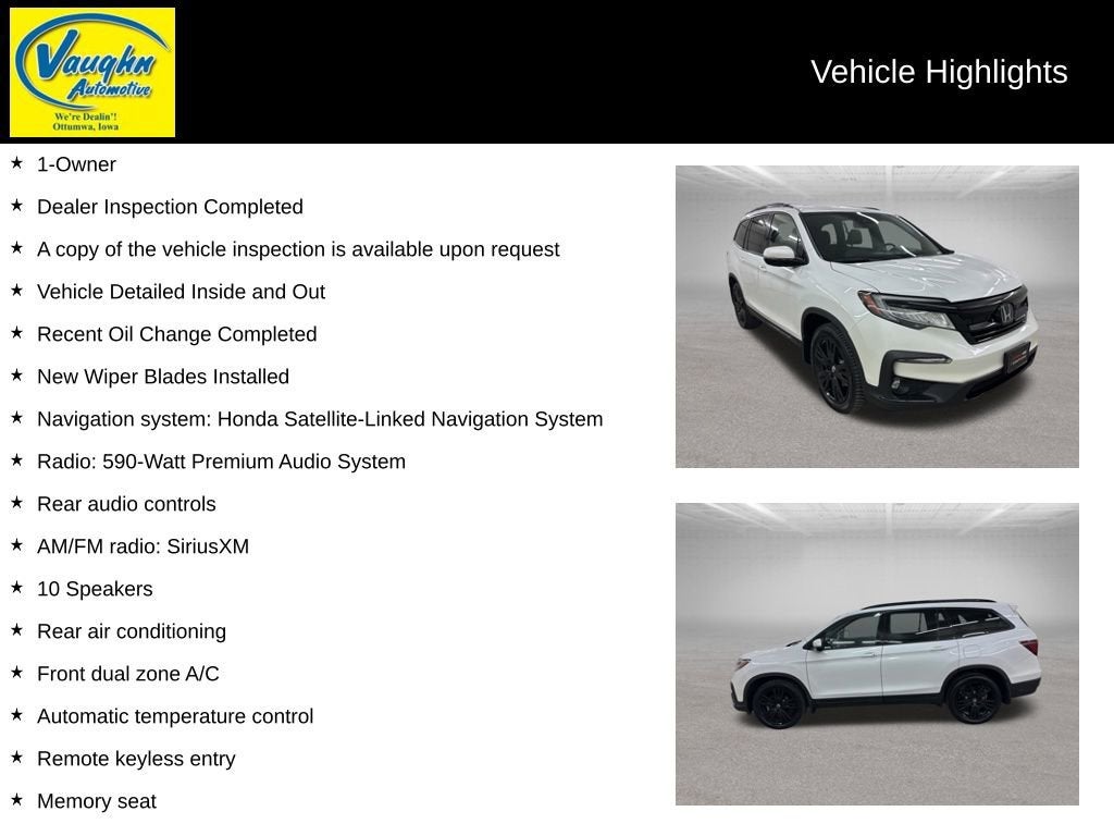 BUY ONLINE, WE SHIP!!! NO HIDDEN COSTS, NO HAGGLE PRICING, & OUR VEHICLES ARE MARKET PRICED DAILY AT VAUGHN AUTOMOTIVE.Certified. 1-Owner, Dealer Inspection Completed, A copy of the vehicle inspection is available upon request, Vehicle Detailed Inside and Out, Recent Oil Change Completed, New Wiper Blades Installed, 9-Speed Automatic, AWD, Black w/Perforated Leather Seat Trim, 10 Speakers, 3rd row seats: split-bench, A/V remote: CabinControl, ABS brakes, AM/FM radio: SiriusXM, Apple CarPlay/Android Auto, Auto High-beam Headlights, Auto-dimming door mirrors, Auto-dimming Rear-View mirror, Automatic temperature control, Blind Spot Information (BSI) System warning, Dual front impact airbags, Dual front side impact airbags, Electronic Stability Control, Emergency communication system: HondaLink, Exterior Parking Camera Rear, Forward collision: Collision Mitigation Braking System (CMBS) + FCW mitigation, Front dual zone A/C, Front fog lights, Fully automatic headlights, Garage door transmitter: HomeLink, Headphones, Heated & Ventilated Front Bucket Seats, Heated door mirrors, Heated rear seats, Heated steering wheel, Lane departure: Lane Keeping Assist System (LKAS) active, Low tire pressure warning, Memory seat, Navigation system: Honda Satellite-Linked Navigation System, Occupant sensing airbag, Overhead airbag, Overhead console, Power door mirrors, Power Liftgate, Power moonroof, Power passenger seat, Radio: 590-Watt Premium Audio System, Rain sensing wipers, Rear air conditioning, Rear audio controls, Reclining 3rd row seat, Remote keyless entry, Security system, Speed control, Speed-Sensitive Wipers, Steering wheel mounted audio controls, Telescoping steering wheel, Tilt steering wheel, Traction control, Turn signal indicator mirrors, Wheels: 20 Exclusive Gloss Black Alloy. 3.5L V6 24V SOHC i-VTEC Platinum White Pearl 2022 Honda Pilot Black Edition Priced below KBB Fair Purchase Price! 19/26 City/Highway MPGCertification Program Details: J.D. Power Edge Certified Pre-Owned: • 90 Day/3,000 Mile Limited Warranty with Platinum (The Best) Coverage • 165-Point Inspection o Vehicle History Report o Full Road Test o Tire & Brakes o Transmission o Engine Components o Electrical Components • 24-Hour Roadside Assistance & Towing (1 Year) • Rental car reimbursement • Lodging assistance • Extend coverage options availableOur Vaughn Best Deal Pricing skips the arguing and you get a great deal. Plus it makes buying a car fast and fun! Online Price excludes $25 title, $15 electronic processing, $10 lien Fee (if applicable), and $180 Vaughn processing fee. Iowa buyers will pay Iowa Use Tax & License at delivery. Out of state buyers will pay their local tax, license, and other fees at delivery plus $165 out-of-state registration service fee. Vehicle not available for sale to other licensed dealers or vehicle resellers. Drive to Ottumwa and find out why people have been buying their vehicles from our family since 1934.http://www.realdeal.com/