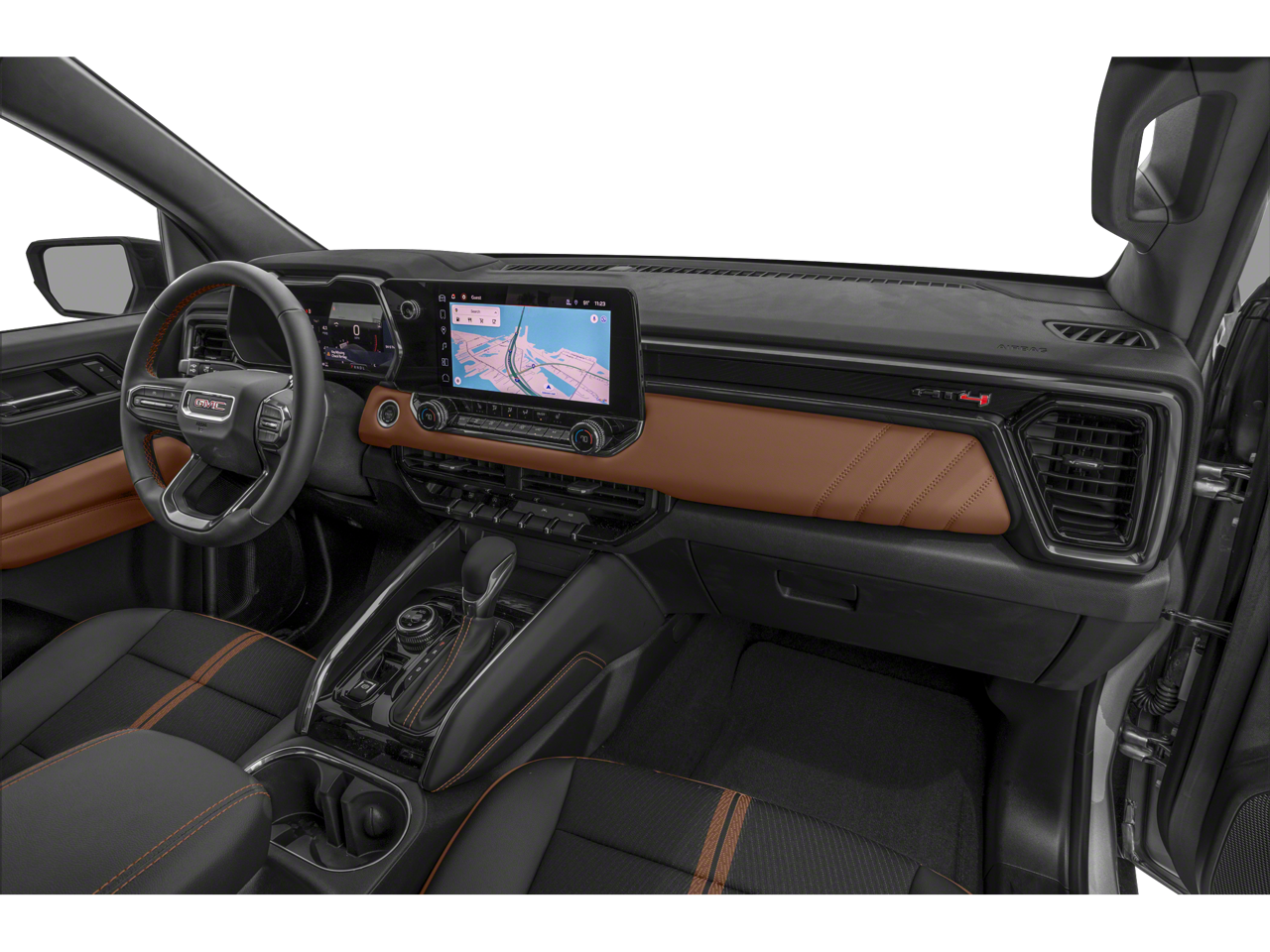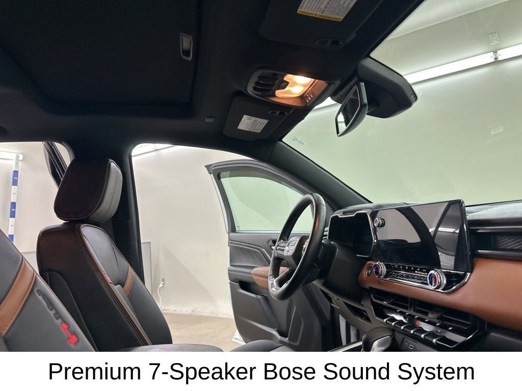 Inside, the Canyon AT4 pampers you with luxurious perforated leather-appointed seating, heated and ventilated front seats, and a premium Bose audio system. The spacious cabin offers ample room for passengers and cargo, with a versatile split-folding rear seat and a convenient spray-on bedliner. The advanced infotainment system, complete with wireless Apple CarPlay and Android Auto, keeps you connected and entertained on the go.