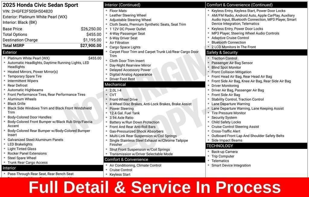 BUY ONLINE, WE SHIP!!! NO HIDDEN COSTS, NO HAGGLE PRICING, & OUR VEHICLES ARE MARKET PRICED DAILY AT VAUGHN AUTOMOTIVE.1-Owner, Balance of Factory Warranty, Dealer Inspection Completed, A copy of the vehicle inspection is available upon request, Vehicle Detailed Inside and Out, Recent Oil Change Completed, New Wiper Blades Installed, Factory Warranty: • Balance of remaining bumper to bumper factory warranty •, CVT, FWD, Black w/Cloth Seating Surfaces, 8 Speakers, ABS brakes, Adaptive Cruise Control: Adaptive Cruise Control (ACC) with Low-Speed Follow, AM/FM radio, Apple CarPlay/Android Auto, Auto High-beam Headlights, Automatic temperature control, Blind Spot Information (BSI) System warning, Dual front impact airbags, Dual front side impact airbags, Electronic Stability Control, Emergency communication system: HondaLink, Exterior Parking Camera Rear, Fully automatic headlights, Heated door mirrors, Knee airbag, Leather steering wheel, Low tire pressure warning, Occupant sensing airbag, Outside temperature display, Overhead airbag, Power door mirrors, Radio: 180-Watt Audio System, Rear side impact airbag, Rear window defroster, Remote keyless entry, Security system, Split folding rear seat, Steering wheel mounted audio controls, Telescoping steering wheel, Tilt steering wheel, Traction control, Wheels: 18 Gloss Black Alloy. 2.0L I4 DOHC 16V Platinum White Pearl 2025 Honda Civic Sport 31/39 City/Highway MPGOur Vaughn Best Deal Pricing skips the arguing and you get a great deal. Plus it makes buying a car fast and fun! Online Price excludes $25 title, $15 electronic processing, $10 lien Fee (if applicable), and $180 Vaughn processing fee. Iowa buyers will pay Iowa Use Tax & License at delivery. Out of state buyers will pay their local tax, license, and other fees at delivery plus $165 out-of-state registration service fee. Vehicle not available for sale to other licensed dealers or vehicle resellers. Drive to Ottumwa and find out why people have been buying their vehicles from our family since 1934.http://www.realdeal.com/ma3v0